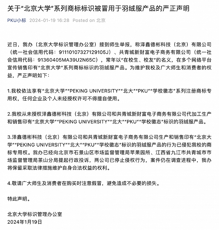 北京大学通报商标标识被冒用于羽绒服:两涉事公司已停止侵权