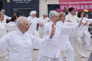 2023年5月1日,在法国圣日耳曼昂莱,太极拳爱好者在第五届太极拳集体演练暨相搏国际邀请赛上表演太极拳。新华社记者 孙鑫晶 摄