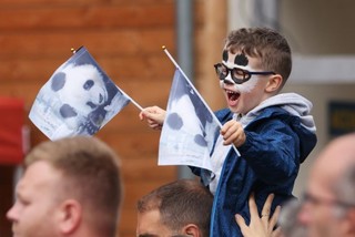 2023年7月26日,在法国圣艾尼昂市博瓦勒野生动物园外,一名儿童等待送别熊猫“圆梦”。新华社记者 高静 摄