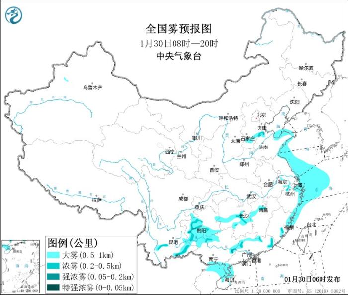 此外,1月30日早晨至上午,河北南部、山东东部、浙江北部和东部、福建东部、湖南中部、江西中部、贵州中南部、云南中部和东部、广西北部和南部、广东北部和西南部、海南北部等地的部分地区有能见度不足1公里的大雾天气,其中,河北南部、浙江北部、湖南中部、贵州中部、云南中部和东部、广东北部等地的部分地区有能见度不足500米的浓雾,局地有能见度不足200米的强浓雾。