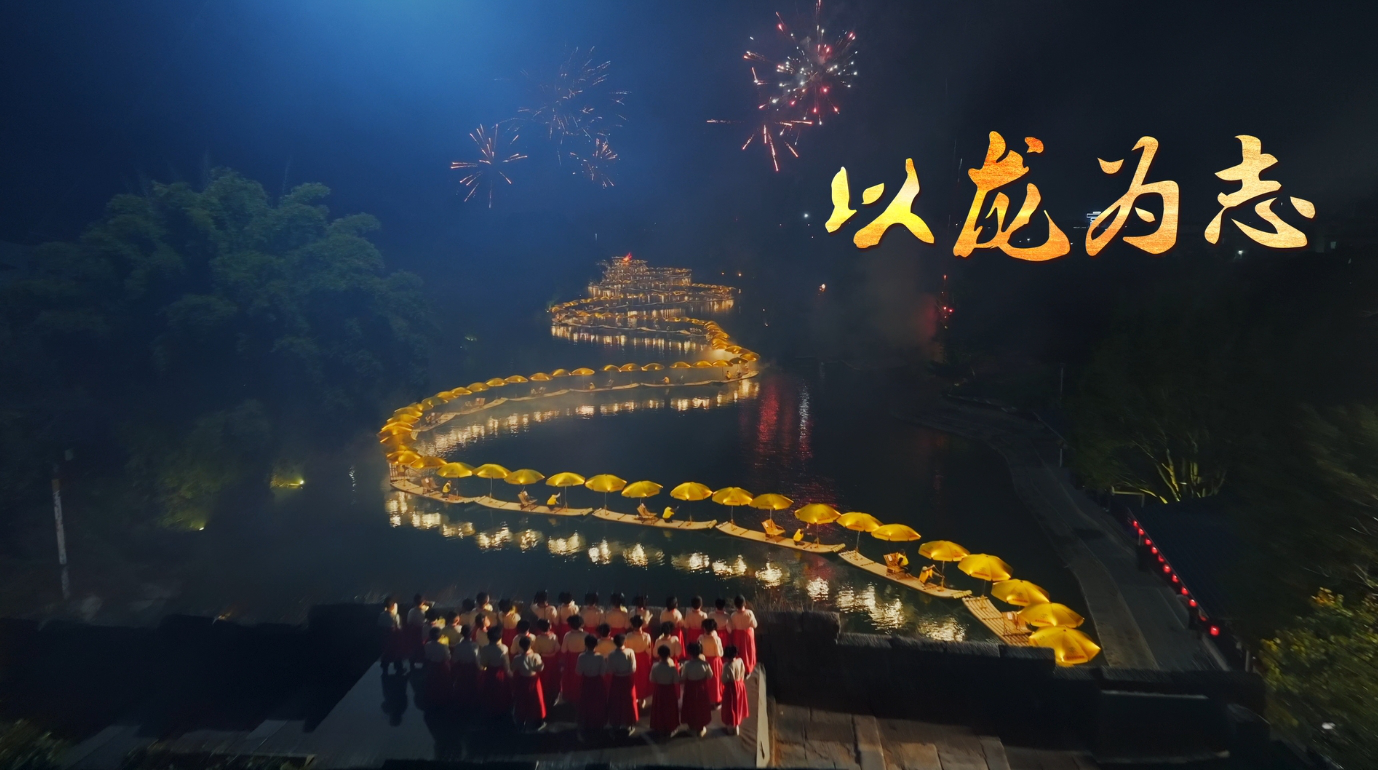 暮色下,遇龙河水流缓缓,远方连绵起伏的山峦勾勒出雄伟的轮廓,河面一条百米龙灯船金光璀璨,宛如一条金龙蜿蜒而来,与漓江山水大背景融成一幅令人叹为观止的奇妙景观。天真烂漫的孩子置身于此,吟诵着诗词“水不在深,有龙则灵”,龙的志向由此刻生根发芽。