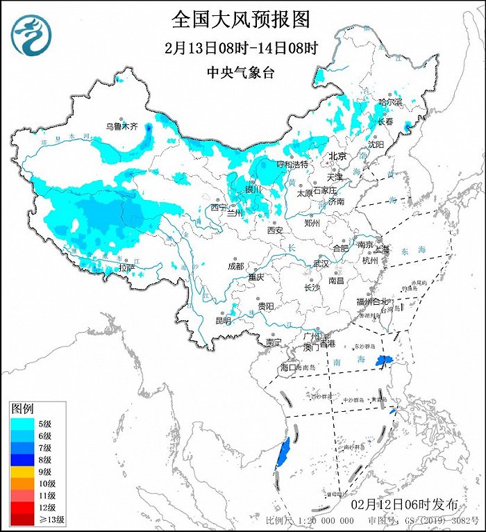 2月13日08时至14日08时,内蒙古、黑龙江南部、吉林西部、辽宁西部、新疆北部、青海西南部等地部分地区有5~6级风,阵风7~8级,其中,新疆东北部部分地区有7~8级风,局地阵风9级。南海东北部和西南部的部分海域有7级风,阵风8~9级。