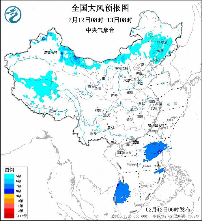 央视网消息:中央气象台2月12日06时继续发布大风蓝色预警,预计,2月12日08时至13日08时,内蒙古、黑龙江中西部、吉林中西部和东南部、辽宁、新疆北部、青海西部等地部分地区有5~6级风,阵风7~8级,其中,新疆北部局地有7~8级风,阵风9级。南海东北部和西南部的部分海域有7~8级风,阵风9级。