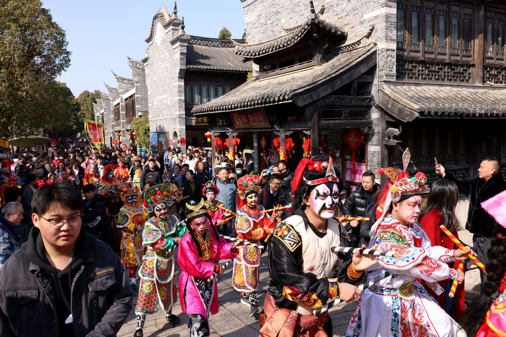 2月12日,游客在山东省枣庄市台儿庄古城观看社火巡游表演。新华社 图
