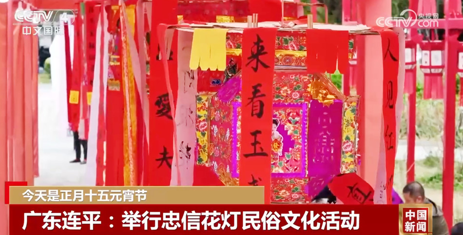 在广东河源连平县,每年正月期间都会举行盛大的忠信花灯民俗文化活动,忠信花灯是一种集竹艺、绘画、剪纸、对联等于一体的民间造型艺术,有600余年历史。当地百姓在元宵节前挂灯,寓意家族人丁兴旺、和美幸福。