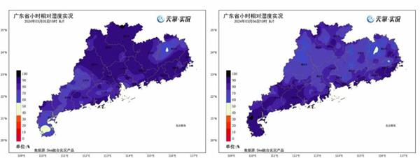 ▲以广东为例,今天上午10时大部地区相对湿度降至70%左右,相比昨天的90%,已经在减轻了。