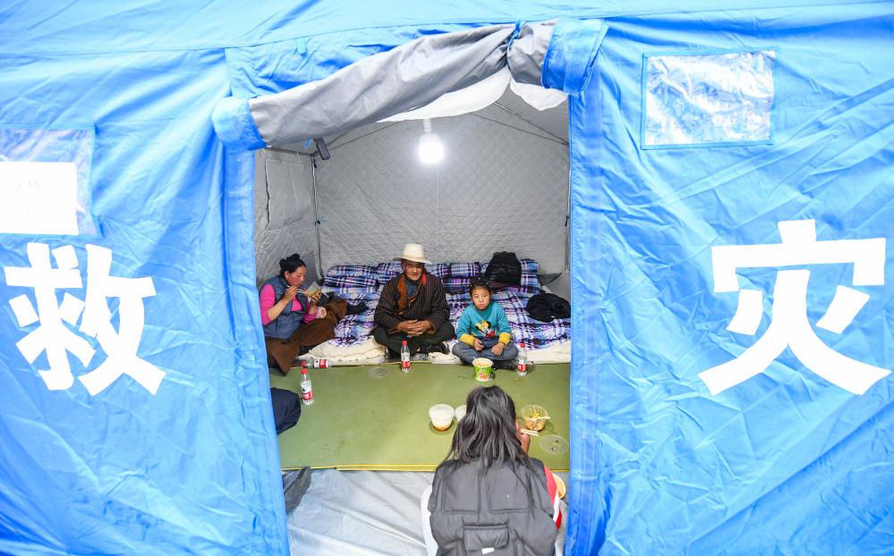 3月17日,在四川省雅江县城关第一完全小学安置点,受灾群众正在吃晚饭。新华社记者 王曦 摄