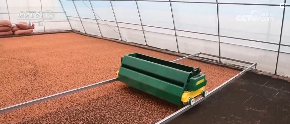 在黑龙江垦区共青农场的智能水稻育秧大棚内,自动水稻播种机械正将稻种播撒在秧盘内。育秧大棚接入了物联网系统的智能调温控水系统,能有效增强大棚保温性能、增加棚内温度。同时,还接入了智能卷帘器、温度传感器等。
