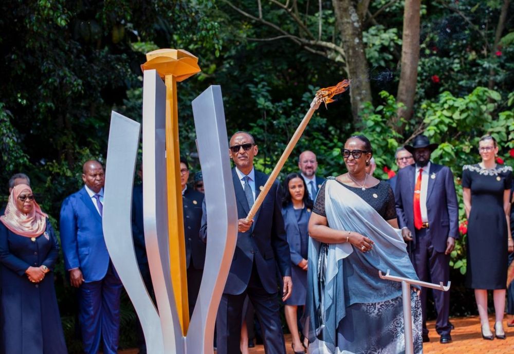 4月7日,在卢旺达基加利大屠杀纪念馆,卢旺达总统卡加梅及夫人珍妮特点燃纪念火炬。新华社发(卢旺达政府供图)