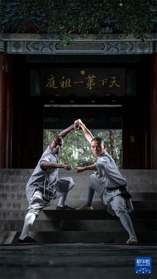 这是延明(左)和师兄延晨在中国河南嵩山少林寺练功(资料照片)。新华社发(受访者供图)