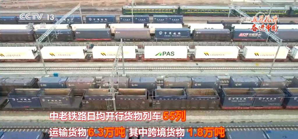 中老铁路日均开行货物列车55列,运输货物6.3万吨,其中跨境货物1.8万吨。