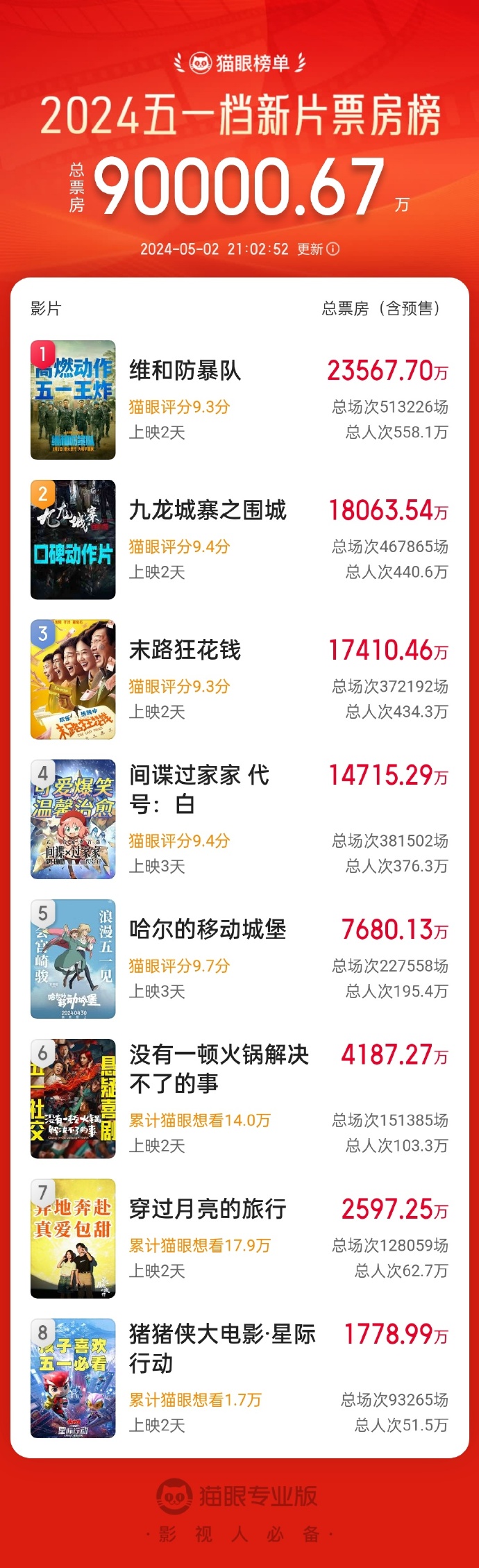 2024年五一档电影新片票房超9亿元 来源:央视网 2024-05-02 21:56 央视网消息:据猫眼专业版数据,截至5月2日21时2分,2024年五一档新片总票房(含预售)超9亿元。《维和防暴队》《九龙城寨之围城》《末路狂花钱》分列票房榜前三位。
