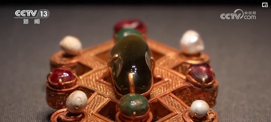此次展览,展出了不少北京明十三陵定陵出土的文物。定陵是明神宗朱翊钧和两位皇后的陵墓,出土文物涵盖明代皇室生活的方方面面,为研究明代政治、经济、文化乃至对外交流,提供了极为珍贵的实物资料。这件万历皇帝的三菱形金带饰,底部是花丝金托,其上密布珍宝。