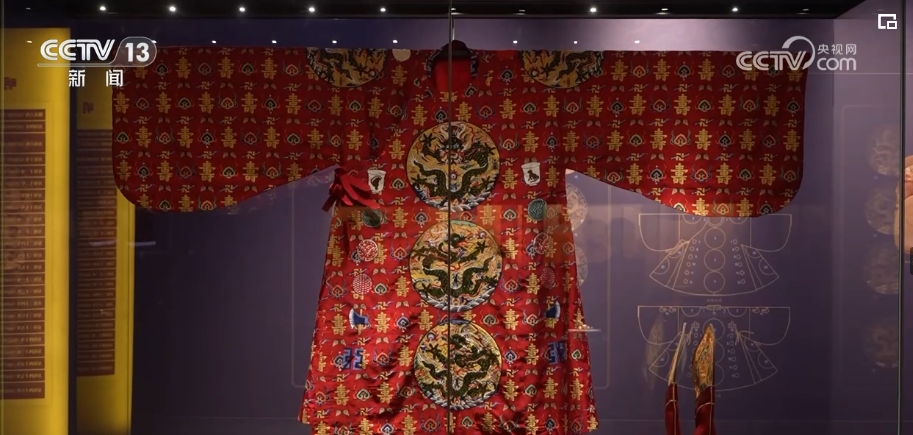 由于丝织品出土时已经氧化,后来,专业人员用传统手工技法复刻出的万历皇帝的红缂丝十二章福寿如意衮服,也是一大看点。