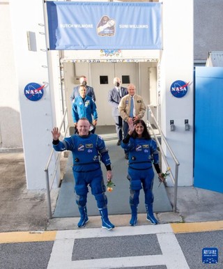 6月5日,在美国佛罗里达州卡纳维拉尔角,宇航员巴里·威尔莫尔(前左)与苏尼·威廉姆斯(前右)准备执行载人试飞任务。新华社发(美国国家航空航天局供图)