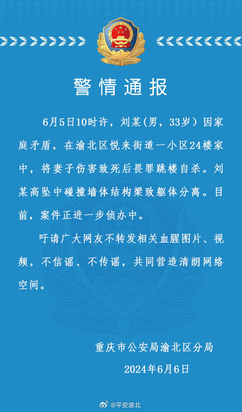 男子将妻子伤害致死、之后跳楼自杀 重庆渝北区警方呼吁:不转发血腥内容