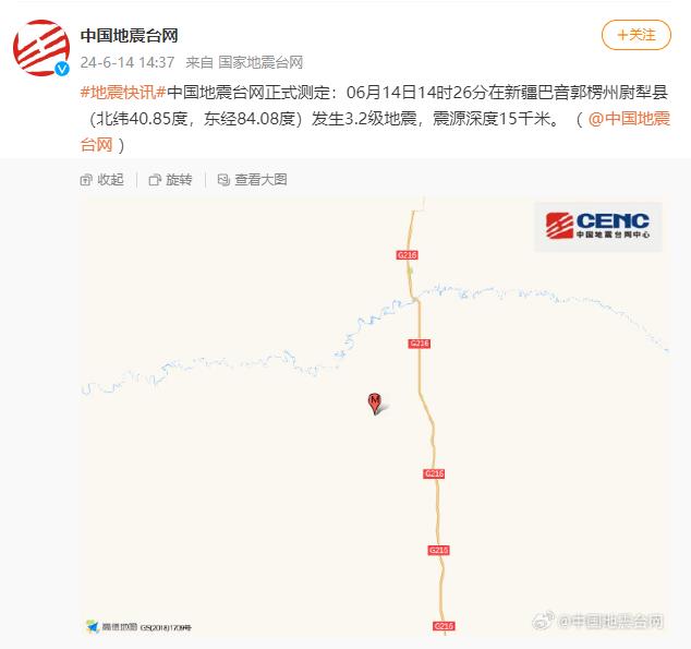 新疆巴音郭楞州尉犁县发生3.2级地震,震源深度15千米 来源:央视网 2024-06-14 14:51 央视网消息:中国地震台网正式测定:06月14日14时26分在新疆巴音郭楞州尉犁县(北纬40.85度,东经84.08度)发生3.2级地震,震源深度15千米。