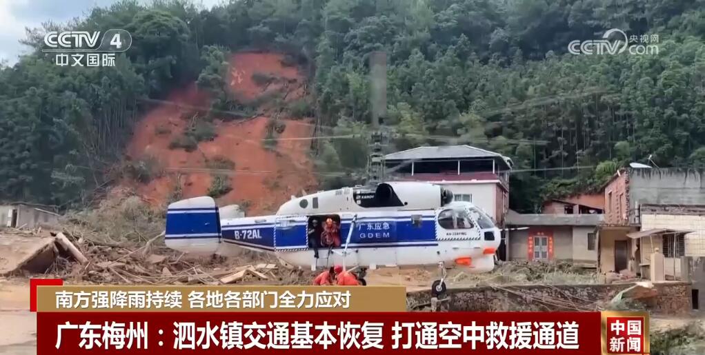 受持续强降雨影响,广东梅州灾情比较严重,山洪暴发导致泗水镇交通、通信、电力供应一度中断,多个村庄与外界失联。经过救援队连夜抢修,19日早上,泗水镇与外界的交通已经基本恢复。在受灾最为严重的大新村,当地紧急打通空中救援通道,保障物资供应。由消防、医疗、通讯技术等9名成员组成的第一批救援小分队,第一时间通过航空救援直升机进入大新村,在不具备降落条件的情况下,超低空悬停跳落地面。