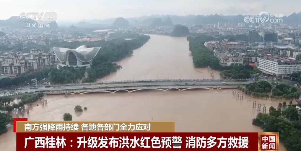 受强降雨影响,广西桂林漓江全线水位持续上涨。桂林水文部门19日升级发布了洪水红色预警。在桂林市区,复涨的河水倒灌到一些沿江道路,导致交通阻断、人员被困,当地消防等救援力量积极开展救援工作。