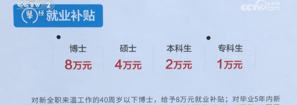浙江省温州市人力资源和社会保障局副局长庄加灵介绍,今年上半年,温州新增55万个就业(和)实习岗位。从专科生、本科生、硕士生,博士生四类,人社局分别给予就业补贴是1万元、2万元、4万元和8万元。今年上半年到现在,已经为中小微企业发放了2.2个亿元的就业补贴。