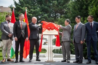现场来宾共同为布达佩斯中国文化中心牌匾揭幕。图片由中国驻匈牙利大使馆提供