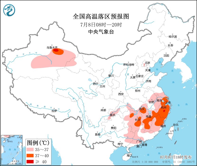 预计7月8日白天,新疆南疆盆地和吐鲁番盆地、苏皖中南部、上海、湖北南部、湖南大部、江西、浙江、福建、广西东部、广东西部和北部等地有35~36℃高温天气,其中,新疆吐鲁番盆地、江苏南部、上海大部、湖北东南部、湖南北部和东部、江西中南部、浙江大部、福建中北部等地部分地区最高气温37~39℃,新疆吐鲁番盆地、浙江中部局地可达40℃以上。
