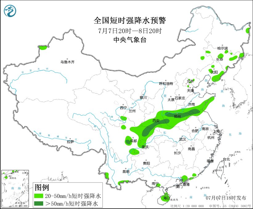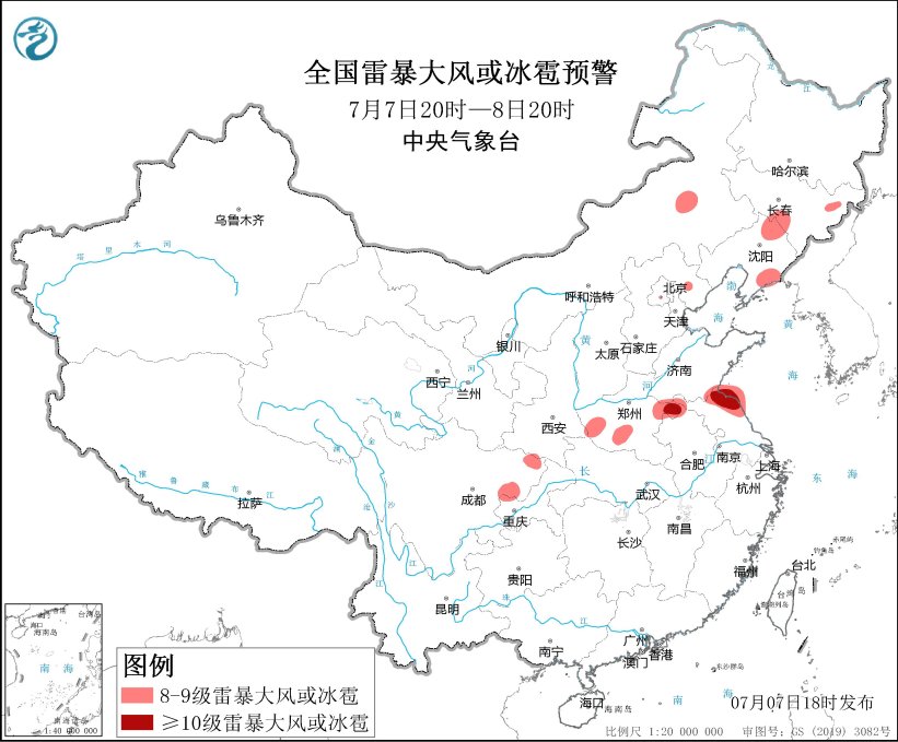 预计7月7日20时至8日20时,吉林中东部、辽宁北部和东部、河北东北部、山东南部、河南东部和西南部、安徽北部、江苏北部、四川东北部等地的部分地区将有8级以上雷暴大风或冰雹天气,其中,河南东部、安徽北部、江苏北部等地的部分地区将有10级以上雷暴大风,最大风力可达11级以上;吉林中东部、辽宁中东部、新疆伊犁河谷、陕西中南部、山西西南部、天津北部、山东南部、河南、安徽北部、江苏北部、湖北西北部、四川中部和东北部、重庆西南部、云南南部、海南岛北部等地的部分地区将有小时雨量大于20毫米的短时强降水天气,其中,陕西南部、山东南部、河南中部、江苏北部、四川东北部等地的部分地区小时雨量大于50毫米,最大可达80毫米以上。