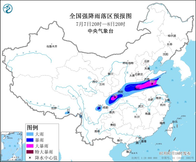 预计,7月7日20时至8日20时,四川盆地北部和西南部、陕西东南部、山西南部、河南中北部、山东南部、苏皖北部等地有大到暴雨,其中,山东南部、江苏北部、河南东部、四川盆地北部等地部分地区有大暴雨,山东南部局地有特大暴雨(250~270毫米);上述地区伴有短时强降水(最大小时降雨量30~50毫米,局地可超过80毫米),局地有雷暴大风等强对流天气。
