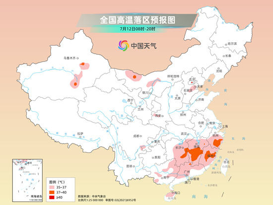 气温方面,今明两天由于副热带高压东退减弱,高温主要集中在江南、华南一带,强度也相对较弱。中央气象台今早继续发布高温黄色预警,预计今天白天,湖南中南部和东部、江西、浙江大部、福建、广西东部、广东中北部以及新疆东部、内蒙古西部、河北中部等地有35℃以上高温天气;其中,新疆东部、湖南东南部、江西中南部、浙江南部、福建中东部等地的部分地区最高气温可达37至39℃。