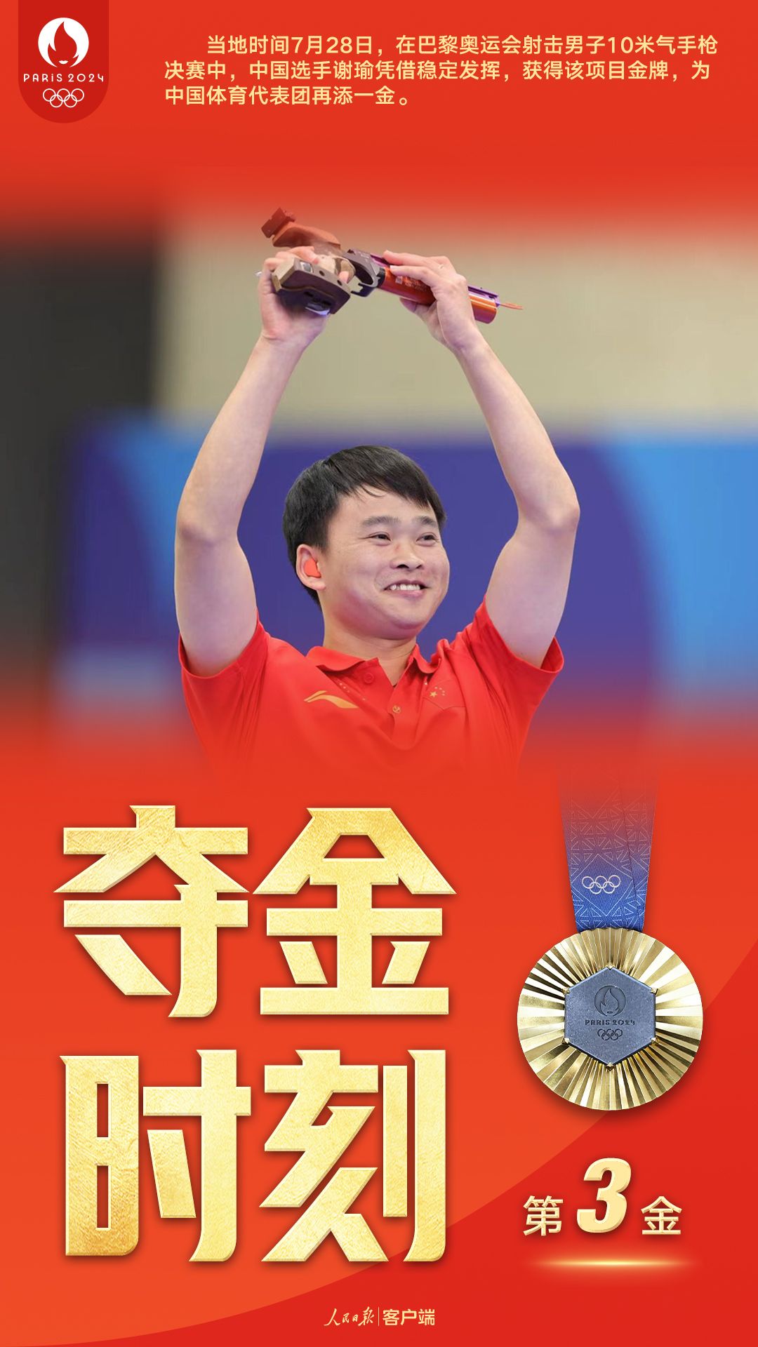 中国队第3金!谢瑜获男子10米气手枪金牌 来源:人民日报客户端 2024-07-28 16:32 当地时间28日,在巴黎奥运会射击男子10米气手枪决赛中,中国选手谢瑜凭借稳定发挥,获得该项目金牌,为中国体育代表团再添一金。