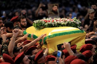 8月1日,在黎巴嫩首都贝鲁特,真主党成员参加真主党高级军事指挥官福阿德·舒库尔的葬礼。新华社发(比拉尔·贾维希摄)