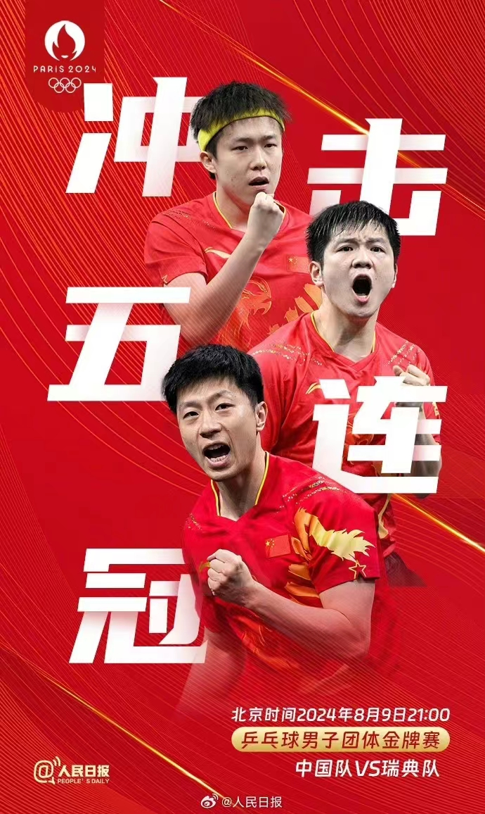 今晚冲金!国乒男团冲击奥运五连冠 来源:人民日报微博 2024-08-09 19:54 今晚21:00,巴黎奥运会乒乓球男团决赛,中国乒乓球男团马龙、樊振东 、王楚钦对阵瑞典队,向奥运五连冠发起冲击。一起为他们加油,期待见证巅峰时刻!