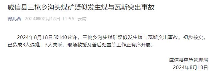 云南省威信县:三桃乡沟头煤矿疑似发生煤与瓦斯突出事故,已造成3人遇难、3人失联