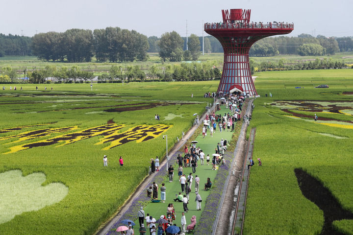 时值暑假,盘锦红海滩国家风景廊道游客如织。登上观景台,向南望去是成片的红海滩,转身再看,一幅巨大的稻田画在风中摇曳,令人心旷神怡。