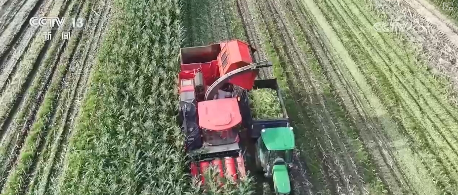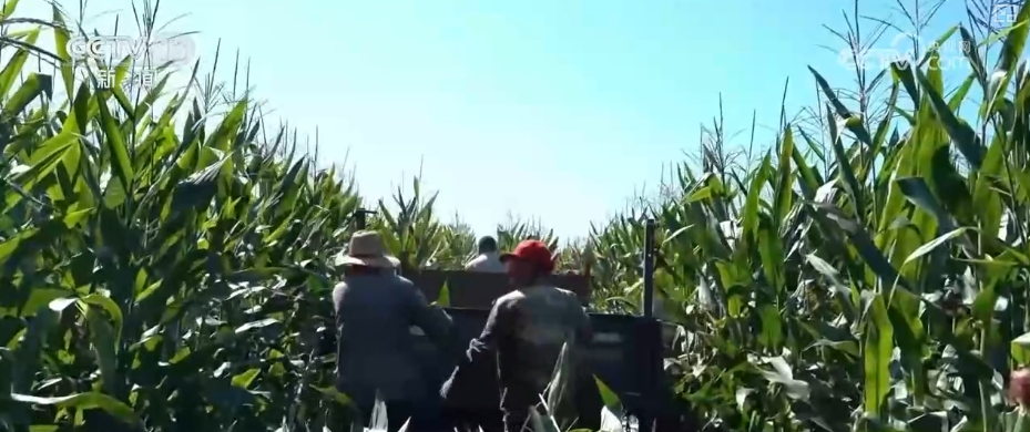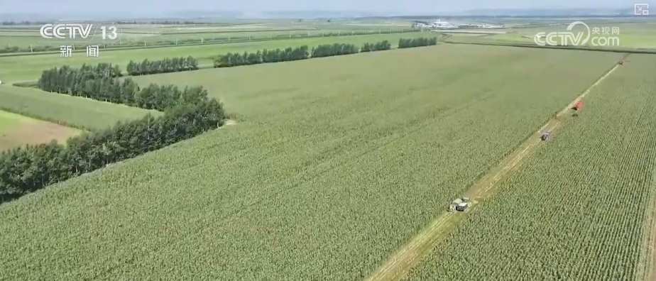 在黑龙江垦区宁安农场,连片的玉米排列整齐、硕果累累,多台大型收割机和工人们忙碌地穿梭在玉米地中进行收割作业。