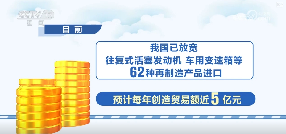 目前,我国已放宽了往复式活塞发动机、车用变速箱等62种再制造产品进口,预计每年创造贸易额近5亿元。