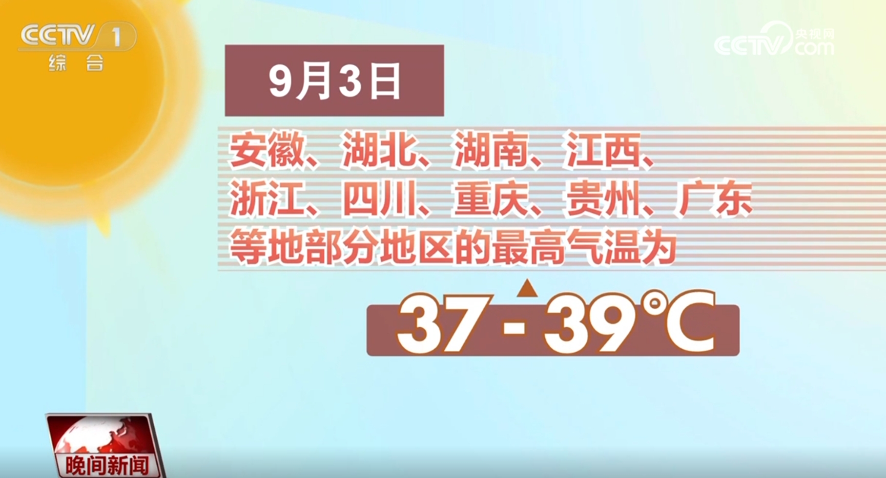 中央气象台预计,未来一周,南方大部高温天气还将持续。9月3日,安徽、湖北、湖南、江西、浙江、四川、重庆、贵州、广东等地部分地区的最高气温为37℃—39℃,四川、重庆局地可达40℃以上。中央气象台继续发布高温黄色预警。公众需尽量避免午后气温较高时段出行,谨防中暑。