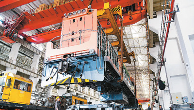 江苏常州中车戚墅堰机车有限公司总组装车间内,出口智利氢能源机车的落车工作正有序进行。夏晨希摄(人民视觉)