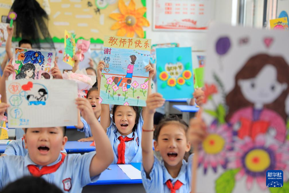 教师节来临,安徽省淮北市泉山路学校学生手工制作贺卡,表达对老师的感谢和祝福。