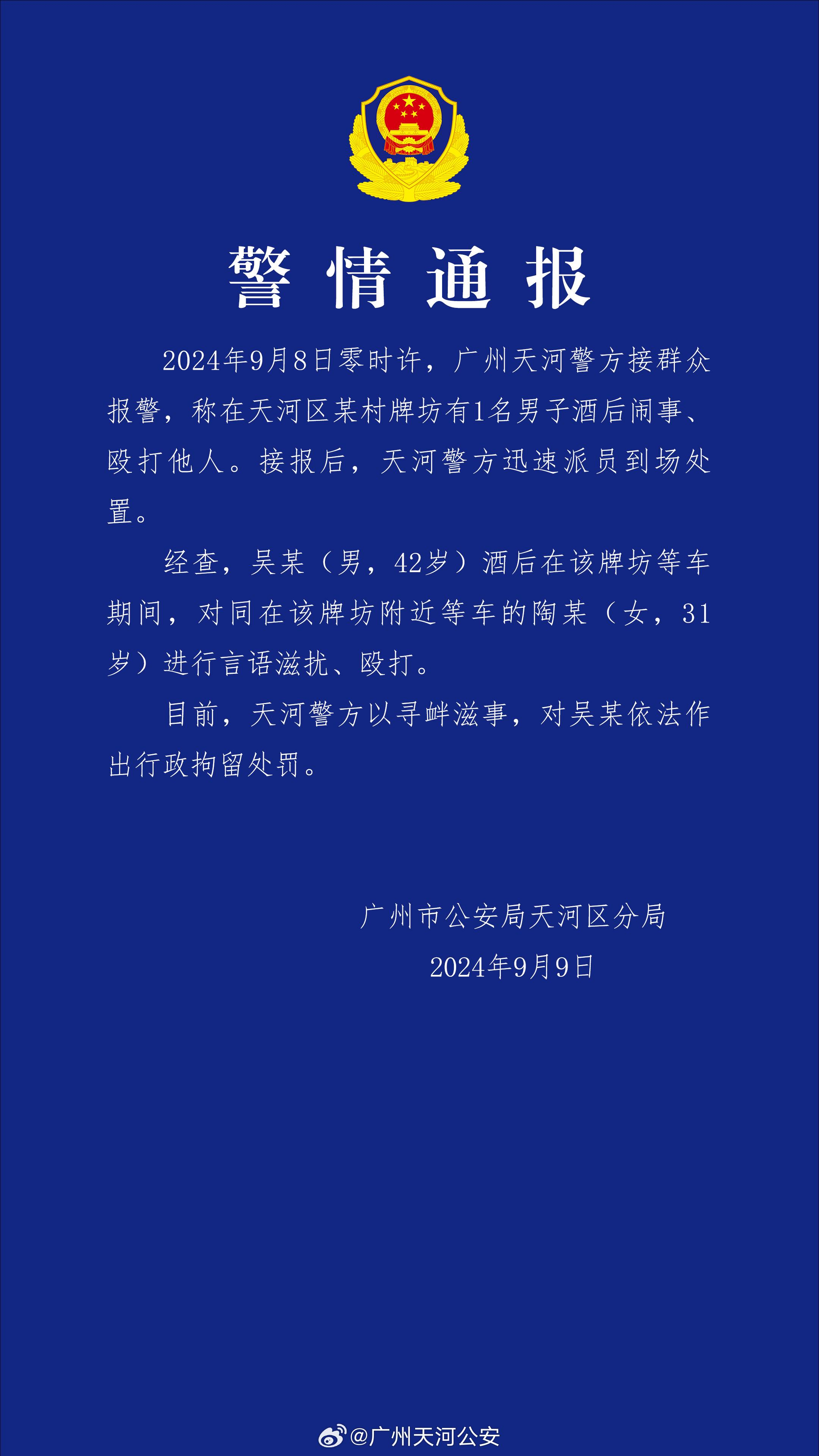 ·一男子酒后当街滋扰、殴打女子,广州警方通报:行拘。