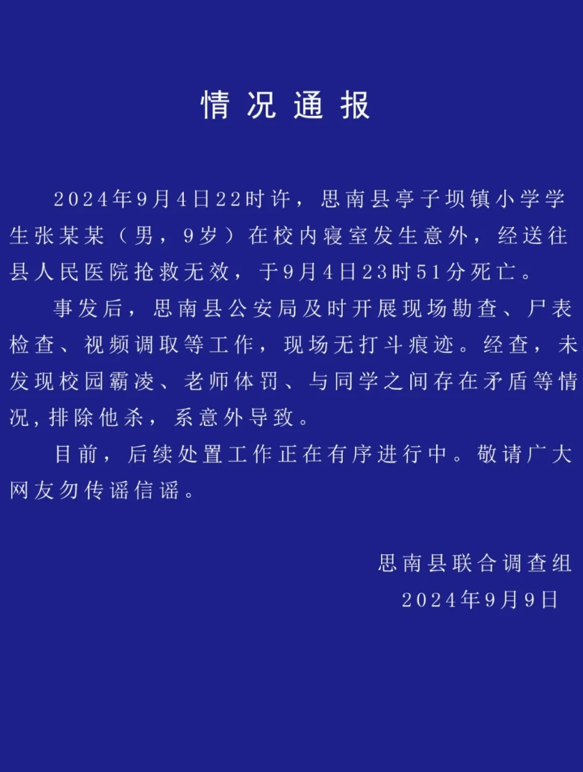 ·贵州思南警方通报小学生在校内寝室身亡:排除他杀,系意外。