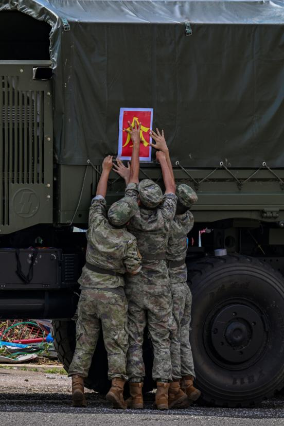 在海口市国兴大道,参与救灾的解放军官兵正在张贴救灾标语,三人成“众”。