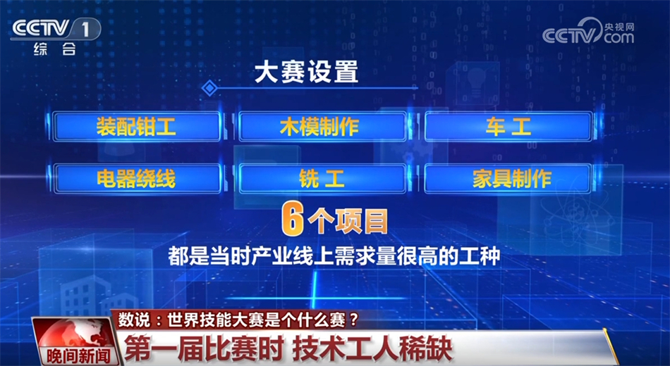 世界技能大赛每两年举办一届,第一届于1950年11月21日在西班牙马德里举办。当时技术工人十分稀缺,大赛设置了装配钳工、木模制作、车工、电器绕线、铣工和家具制作6个项目,都是当时产业线上需求量很高的工种。
