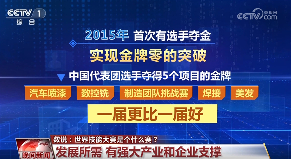 我国在2010年正式加入世界技能组织,2011年首次参赛,2015年首次有选手夺金,实现金牌零的突破,中国代表团选手夺得5个项目的金牌,分别是汽车喷漆、数控铣、制造团队挑战赛、焊接和美发。而此后几年的成绩,也是一届更比一届好。