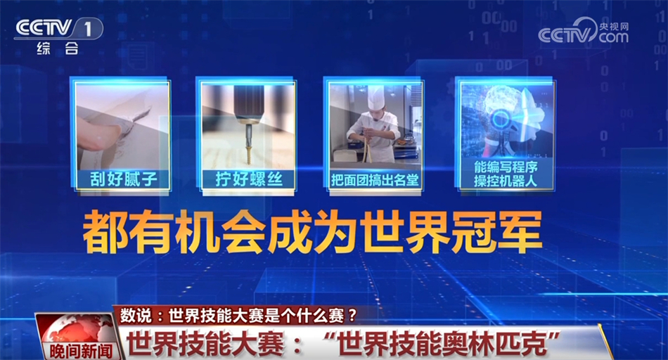 世界技能大赛是由世界技能组织举办的全球规模最大、影响力最大的职业技能竞赛,被称为“世界技能奥林匹克”。刮好腻子、拧好螺丝、把面团搞出名堂、能编写程序操控机器人,都有机会成为世界冠军。