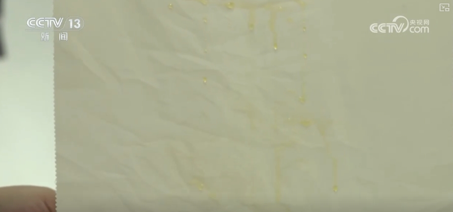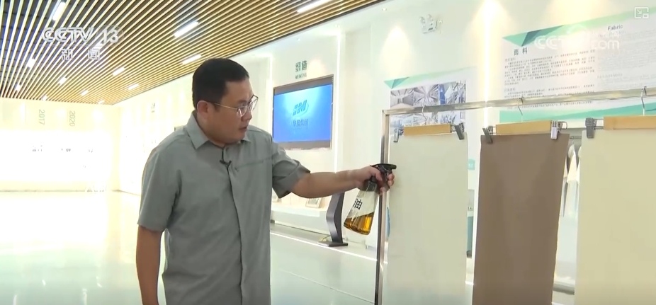 这家企业也非常重视新材料、新产品的研发。这块面料可以防紫外线,工作人员已经用紫外线灯照射了1分钟,没有变红说明隔绝了大部分紫外线。把家里用的调和油喷洒到这块布上,可以看到油就滑落了没有留下油污,这是防油布。而这块布可以抗皱,来回揉搓几乎没有皱痕。