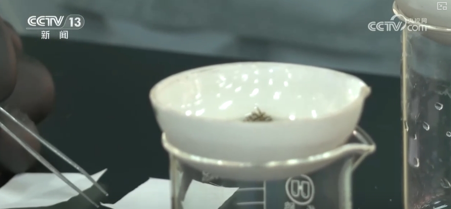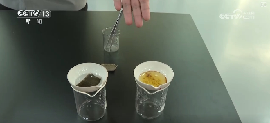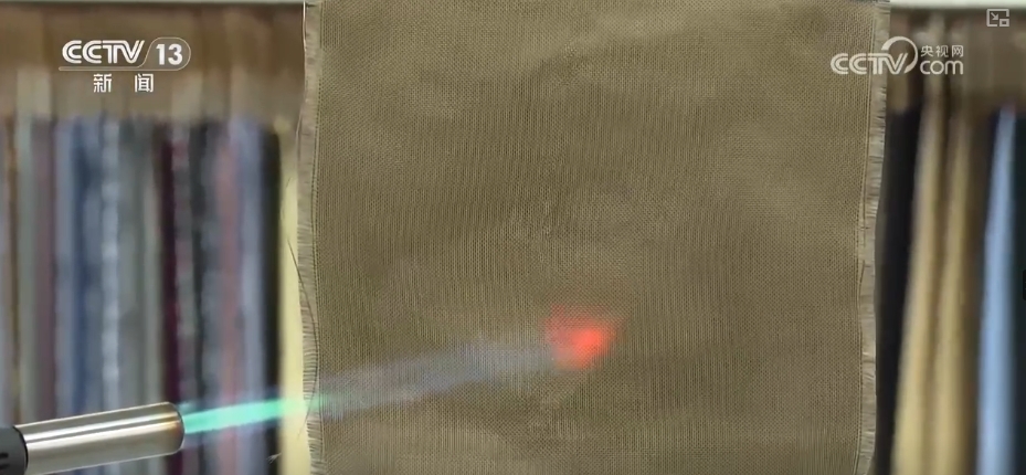 工作人员把一块玄武岩布料和一块普通棉布放到98%的浓硫酸里,看看会有怎样的变化。等待的同时,工作人员用喷枪尝试点燃这块玄武岩布,在1000多摄氏度火焰的灼烧下,这块布并没有被点燃,反而有些像铁一样被烧红了。工作人员介绍,如果长时间对着一个点燃烧,还是能烧穿这块布的,但是无法点燃它。