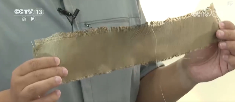 这块布就是用来制造月面国旗的布料。现在能看到在没有染色前,这块布呈现出了它本来的颜色——褐色,手感比较柔软、丝滑。而制作这样的一块布,大约需要记者手中这么大的一块玄武岩。