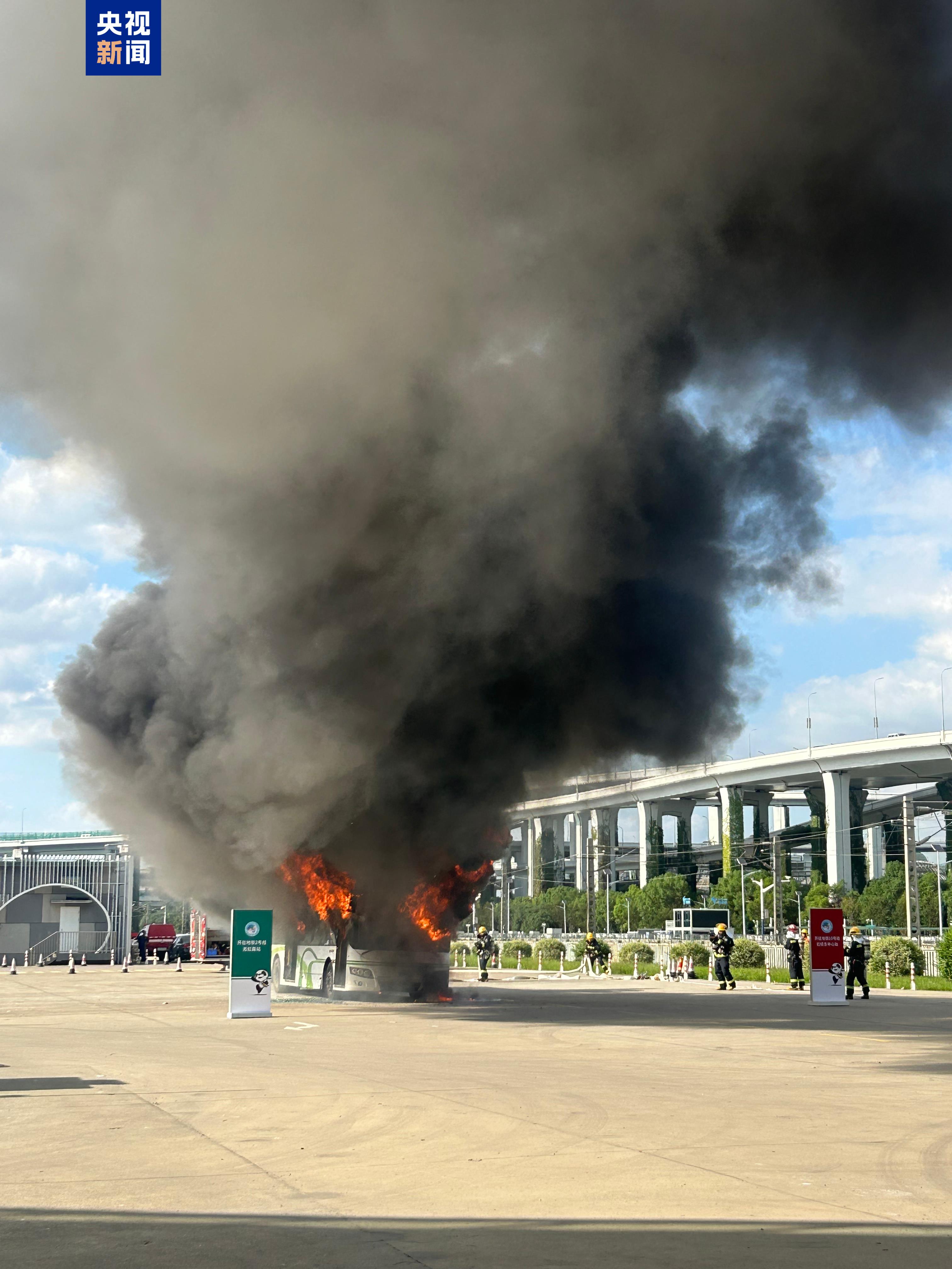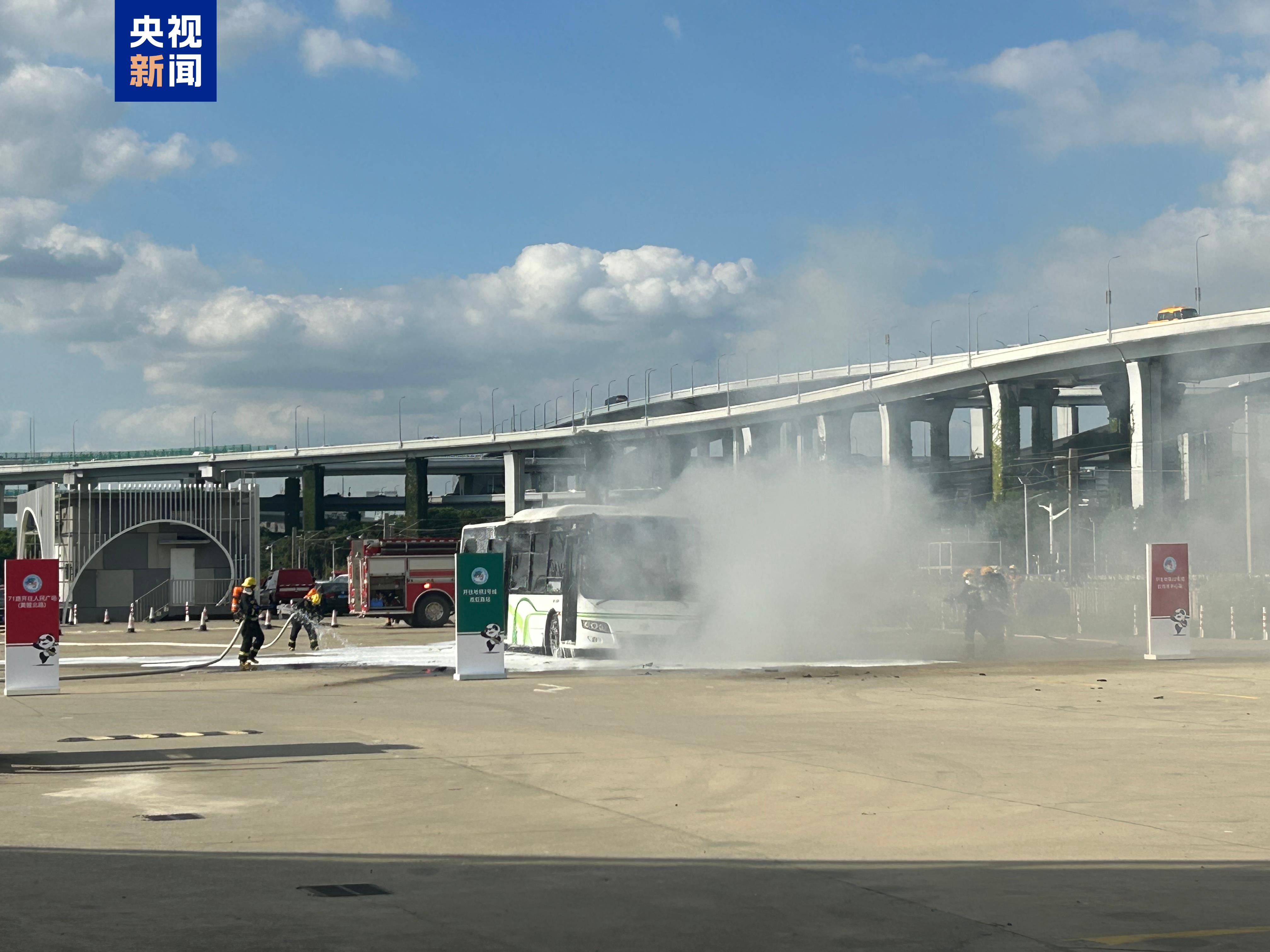 在新能源公交车突发着火事件应急处置演练中,记者在现场看到,进博会停车场内,一辆停靠在站台边的新能源公交车突然冒烟起火,火势可能波及停车场内其他停放的车辆。停车场工作人员发现公交车辆自燃后,立即用灭火器进行灭火,并第一时间拨打110报警。随后,工作人员立即向交通保障现场指挥部报告。