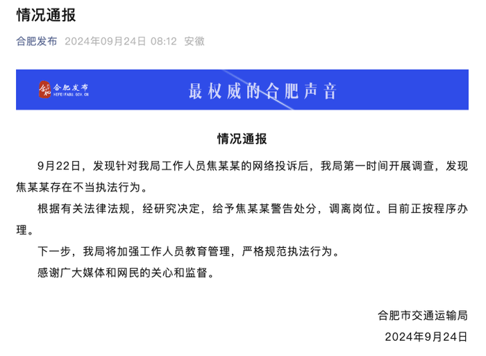 央视网消息:合肥市交通运输局9月24日通报,9月22日,发现针对该局工作人员焦某某的网络投诉后,合肥市交通运输局第一时间开展调查,发现焦某某存在不当执法行为。根据有关法律法规,经研究决定,给予焦某某警告处分,调离岗位。目前正按程序办理。